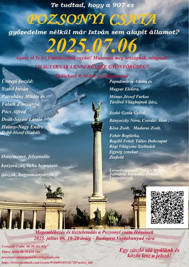A győztes Pozsonyi csatára emlékeznek hagyományőrzők holnap, vasárnap. A rendezvényen a Magyarok Világszövetségének tisztségviselői is részt vesznek, és közülük többen beszédet mondanak: v. Joó Katalin, az MXIVK szkíta konferenciájának elnöke, Falath Zsuzsanna, a Stratégiai Bizottság tagja, Patrubány Miklós elnök, dr. Pócs Alfréd elnökségi tag, dr. Tamasi József, a WHO-Munkacsoport elnöke. Fischer Károly Antal könyve a szkíta és a magyar nyelv azonosságról is kapható lesz. Íme, a szervezők felhívása.