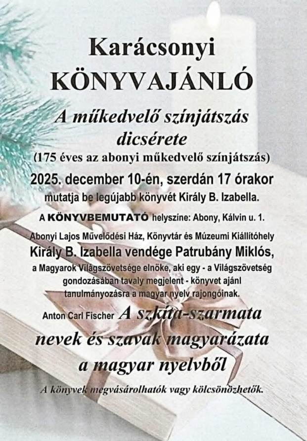 Helyszín: Abonyi Lajos Művelődési Ház, Abony – Kálvin ú. 1.